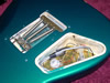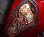 This route is most commonly found on later serialized Charvel V guitars. The route is long and skinny and is attached to the body using 2 screws. The covers were made from the same brushed aluminum material as the commonly found triangle shaped covers.